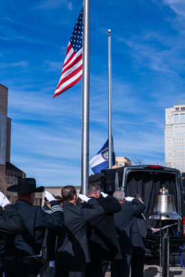 During the ceremony, El Paso County Undersheriff Jeff Kramer joined Commissioner Bill Wysong, 4th Judicial District Attorney Michael Allen, El Paso County Clerk and Recorder Steve Schleiker, Jack Ladley (Executive Director, EPC Public Works), Vernon Stewart (Executive Director, EPC Community Resources), and Sara Metz (Senior Paralegal, EPC County Attorney’s Office)—all veterans of the United States Armed Services—to toll the bell in memory of those who served our great nation and made the ultimate sacrifice for our freedoms.